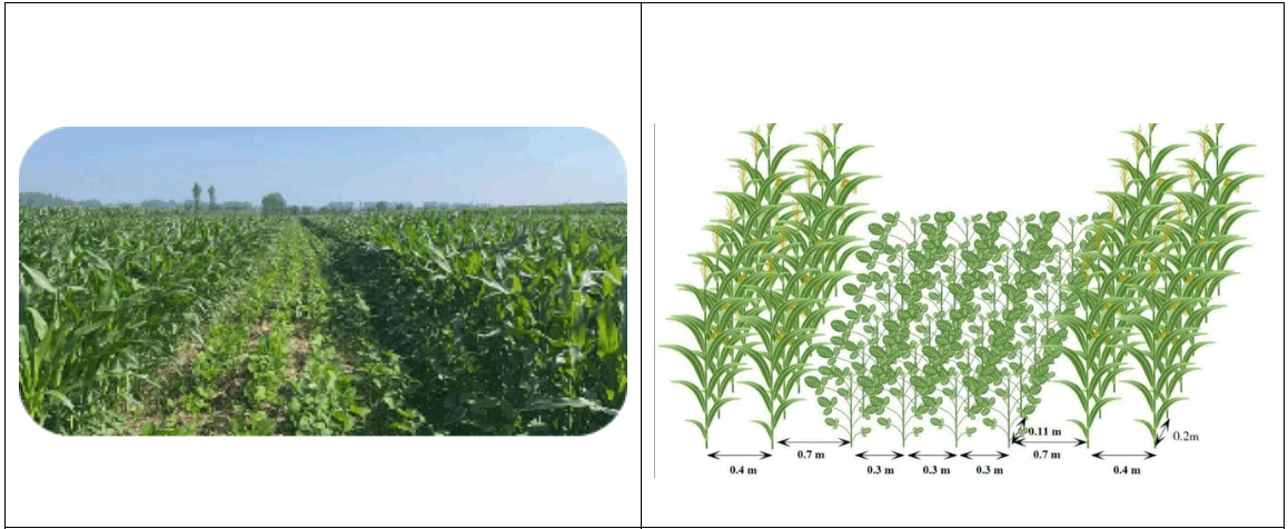 3、根据大豆玉米间作套种农艺特点,大豆采用先旋耕后种植,利于出苗、避免机具拥堵,玉米采用免耕种植,利于抗倒伏;