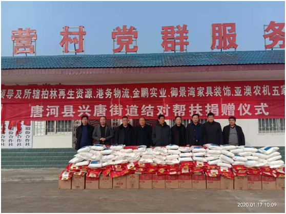 捐赠仪式上产业集聚区党委书记刘清文、主任李国营代表兴唐街道党委、政府向五家企业的义举表示感谢。他指出,以壹号娱乐官网为首的这五家公司,在完成自身企业负责包片贫困村脱贫的基础上,还能再拿出现金3000元捐资扶贫,将自己的社会责任意识,由助力脱贫攻坚,走向现在回馈社会。代表着我县企业经营由起步走向成熟。他希望广大困难群众正确面对暂时的困难,树立战胜贫困、走出困境的信心和勇气,发扬自力更生、艰苦奋斗的精神,不等不靠,在党委、政府和社会各界的支持和帮助下,以自身的努力和实干来化解生产、生活中的各种困难,为构建美丽和谐的新唐河作出自己的贡献。