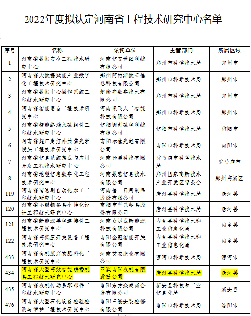 2020年以来,壹号娱乐官网通过科技创新,与科研机构、大专院校等合作,参与国家项目及标准制定,取得了丰硕的研究和应用成果。并获得一种旋耕机刀盘式防拥堵切草装置和一种旋耕机刀轴防缠草装置2项实用新型专利。2023年1月11日,我司被河南省科学技术厅认定为省级智能耕播机具工程研究中心。