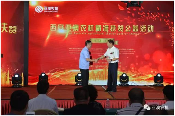 亚澳精准扶贫公益活动现场,中国农机化协会会长刘宪到会致辞,并给予亚澳颁发证书。