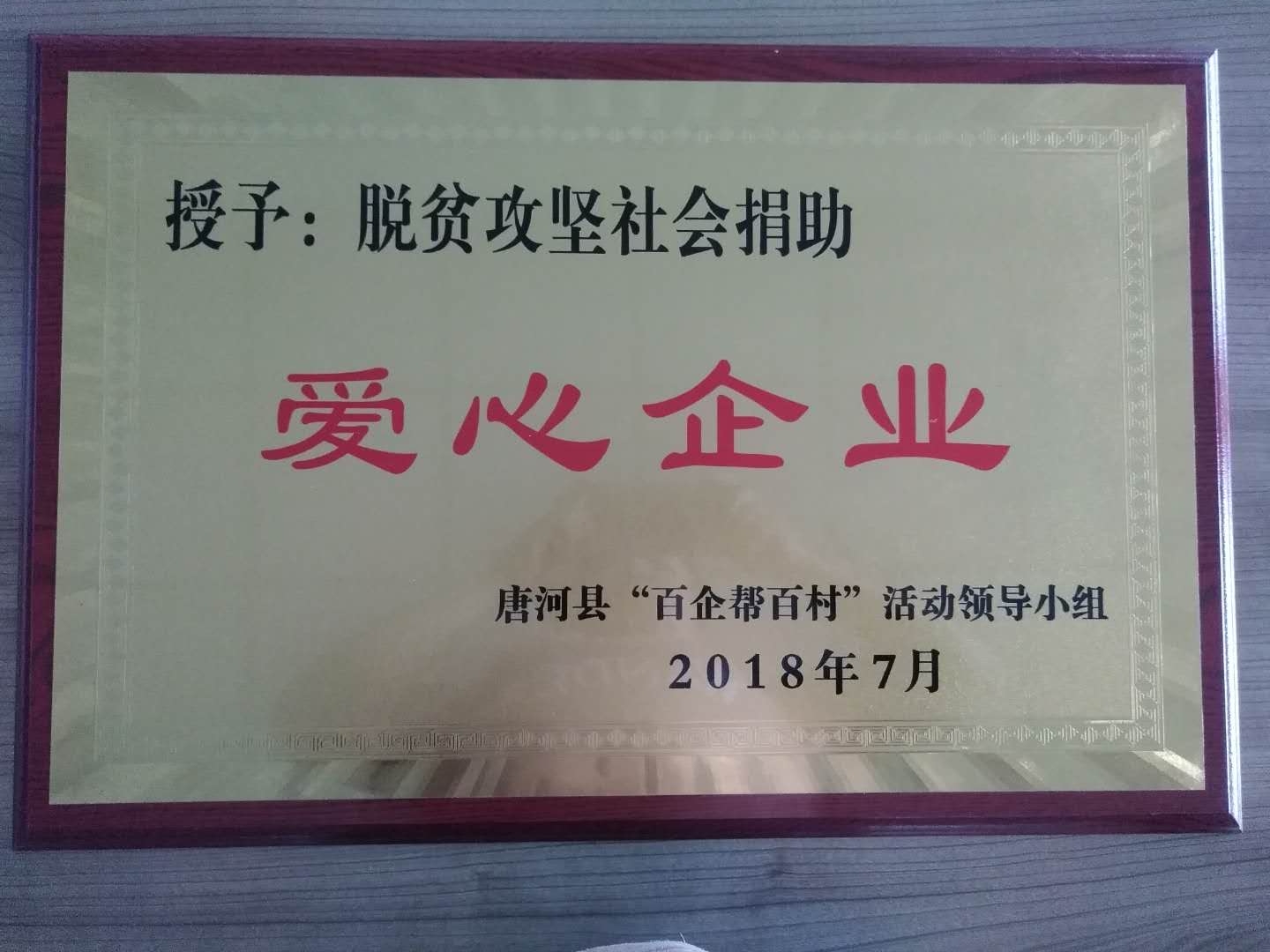 7月9日上午,在唐河县召开的南阳市社会扶贫工作现场会上,壹号娱乐官网有限责任公司被唐河县委县政府授予脱贫攻坚社会捐助“爱心企业”。