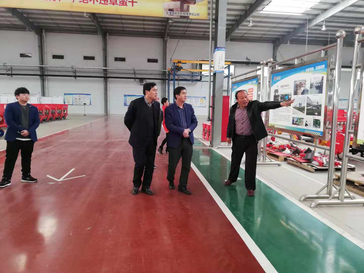 在成品展示区,关于研发创新方面,郭总把2017年公司针对南阳地区的大面积规模化种植作物而研发的小麦花生两用精量播种施肥机作了介绍,把产品特点及功能作用都作了详细的讲解。