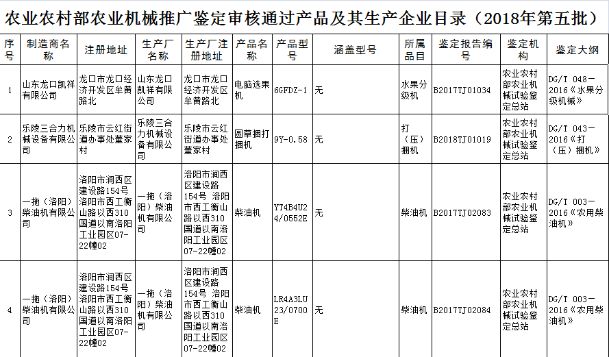 根据农业部农业机械试验鉴定总站2018年第五批部级农机推广鉴定结果的公示,9个型号的机型全部通过农机鉴定总站的批准。