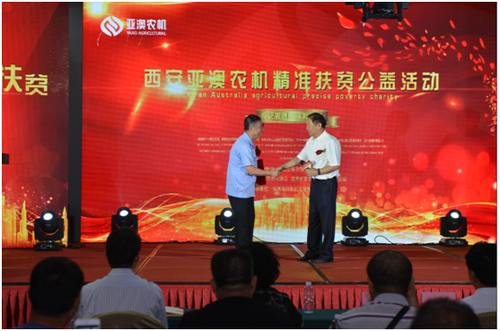 开机仪式上,中国农机化协会还就“甘肃省兰州市永登县”精准扶贫工作给予亚澳高度的认可。永登县团庄村属干旱贫困山区,全村现有7个村民小组,421户、1696人。近年来,帮扶单位先后捐赠了30多台(套)特色农机具,但仍缺少大中型农机具,农机化服务能力不足,不能满足农业生产需求。此次中国农业机械化协会联合亚澳公司等有关单位向团庄村捐赠价值40多万元农业机械,必将对团庄和周边乡村农业和农村经济发展、全面建设小康社会起到很大地推进作用。